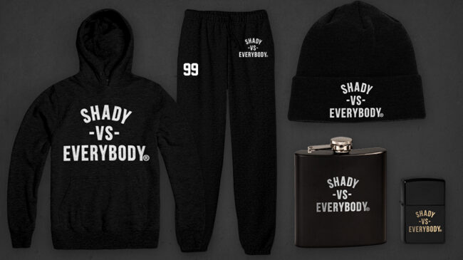 This bundle includes limited edition Shady Vs. Everybody sweatshirt, sweatpants, and beanie.
