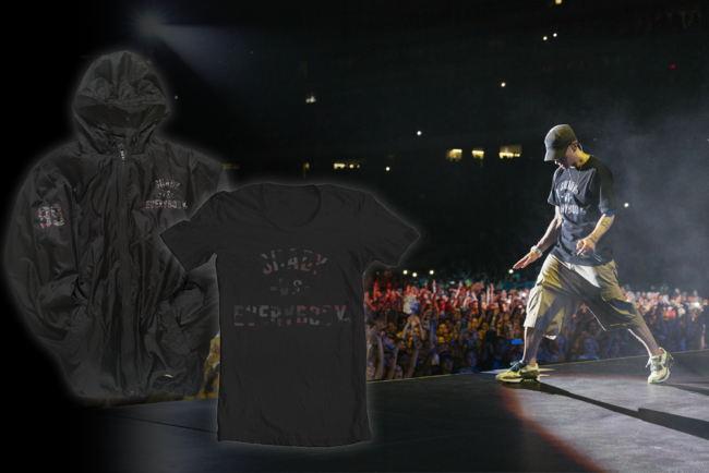 Shady Vs Everybody is back with limited edition items in a brand new camo colorway. Read more after the jump. This run includes a Dickies Windbreaker and t-shirt, which was first seen on stage worn by Eminem during his Rapture Tour. Both items have extremely limited quantities and will be available this one time only. T-shirt is available as both short and long sleeve – choose your option at checkout.