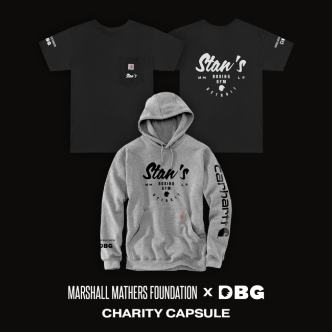 The Marshall Mathers Foundation x DBG #Stan #MMLP collab on Carhartt gear will raise funds to help the Downtown Boxing Gym (DBG Detroit) knock out COVID-19 related learning loss. DBG is a free academic and athletic program on Detroit’s east side that’s working around the clock to prevent students from falling behind during the pandemic.